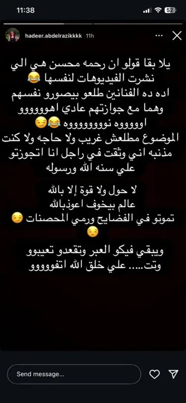 وفيما يتعلق بأزمة رحمة محسن، انتقدت هدير عبدالرازق من روّجوا الفيديو، قائلة: «لا حول ولا قوة إلا بالله، عالم بيخوف، أعوذ بالله، تموتوا في الفضايح ورمي المحصنات، ويبقى فيكوا العبر وتقعدوا تعيبوا على خلق الله اتقوا الله».