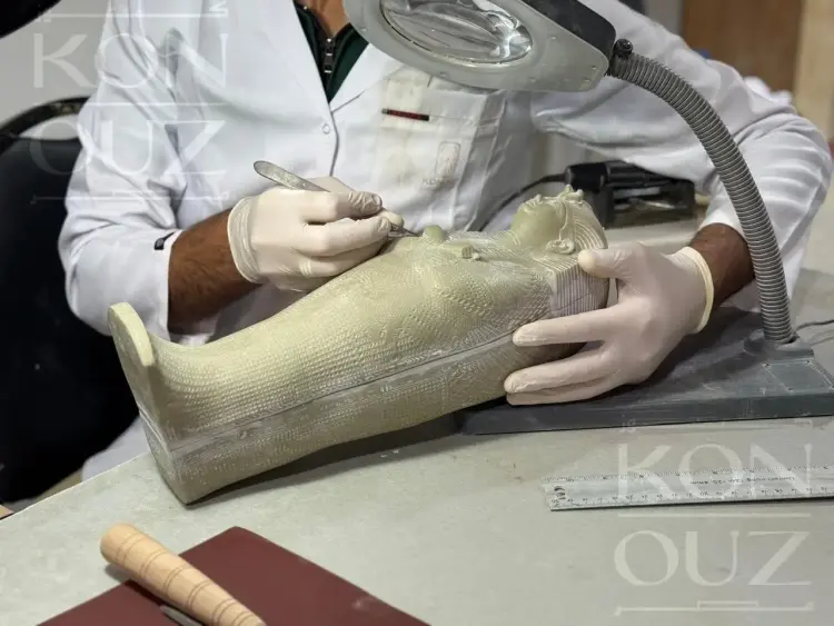 - التنفيذ بدأ من قسم النحت، حيث قام الفنانون المصريون بتجسيد الرموز والزخارف والكتابات الهيروغليفية المستوحاة من التابوت الأصلي.