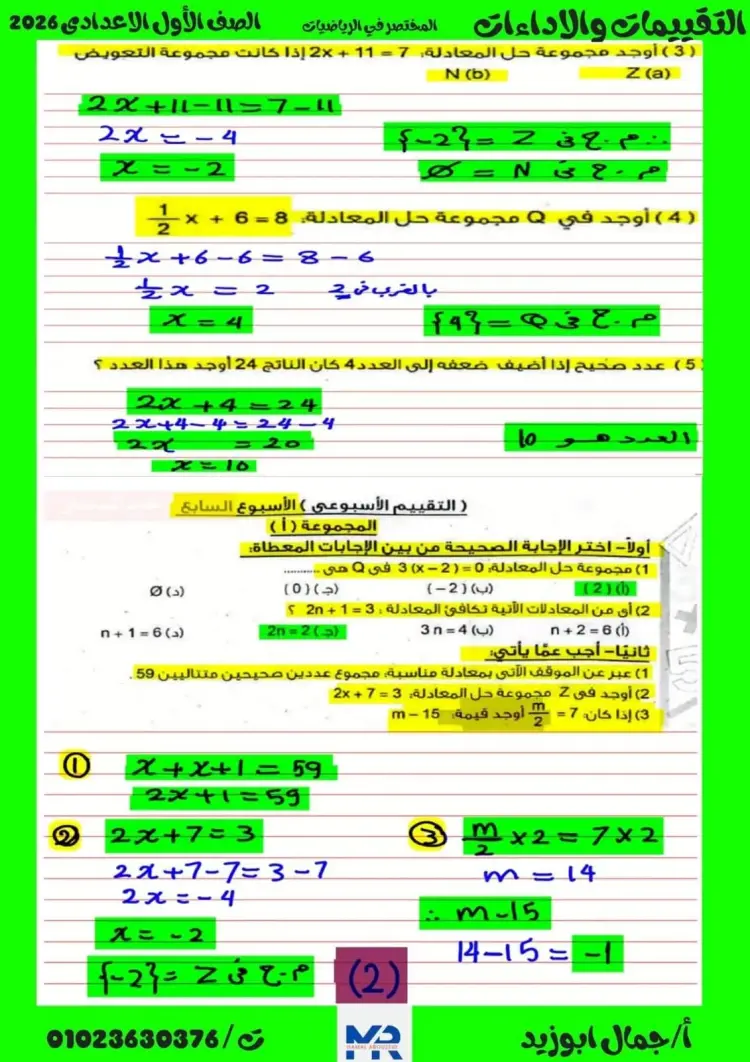 حل الأداء الصفي والواجب المنزلي والتقييم الأسبوعي السابع رياضيات للصف الأول الإعدادي 2026