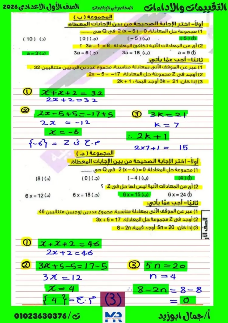 إجابات أداءات وتقييمات رياضيات أولى إعدادي الأسبوع السابع