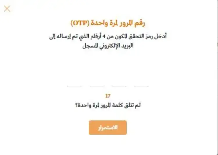 خامسا: قم بإدخال رمز التحقق المكون من 4 أرقام الذي سيتم إرساله إلى البريد الإلكتروني المسجل، ثم اضغط على «استمرار».