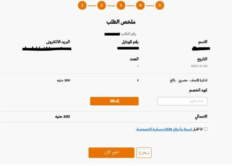 سادسا: يوضح الموقع لك ملخص طلبك موضحا اسمك ورقم الطلب ورقم الموبايل والبريد الإلكتروني الخاص بك، ويطلب من دفع قيمة التذكرة، كما يتيح لك مكان لإضافة أكواد الخصم المتاحة لديك.