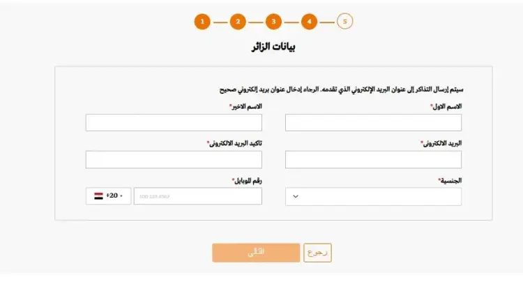 بعد اختيار نوع التذكرة، هناك خمس خطوات لإتمام الحجز وهي كالتالي: