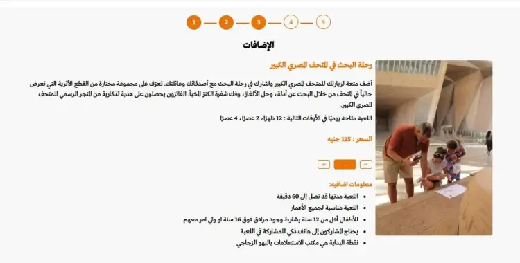 ثالثا: إذا أردت إضافة المتعة إلى رحلتك داخل المتحف، يمكنك من خلال الخطوة الثالثة إضافة لعبة البحث عن الأدلة وحل الألغاز وفك شفرة الكنز أثناء حجز التذكرة، وتقدر تلك الإضافة بنحو 125 جنيها.