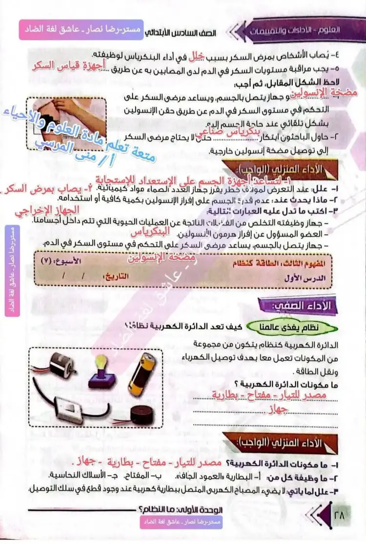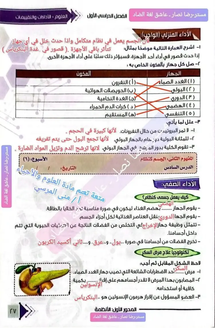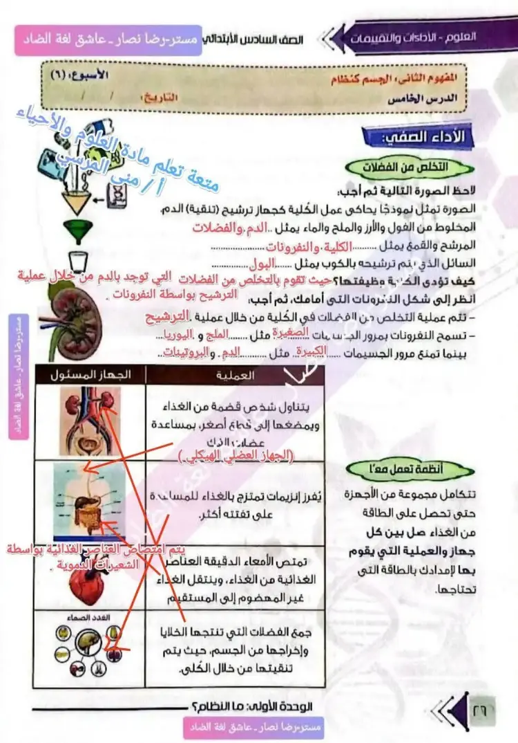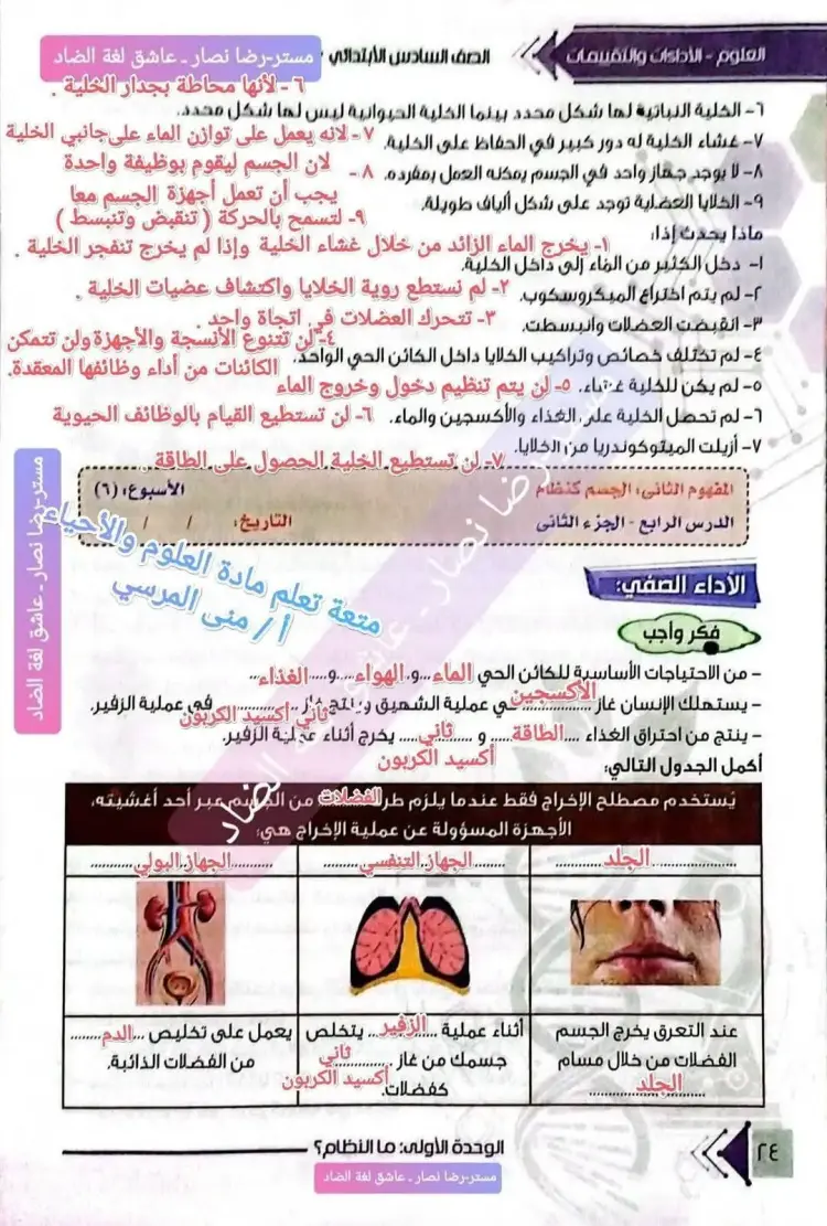 حل الأداء الصفي علوم سادسة ابتدائي الأسبوع السادس ترم أول 2026