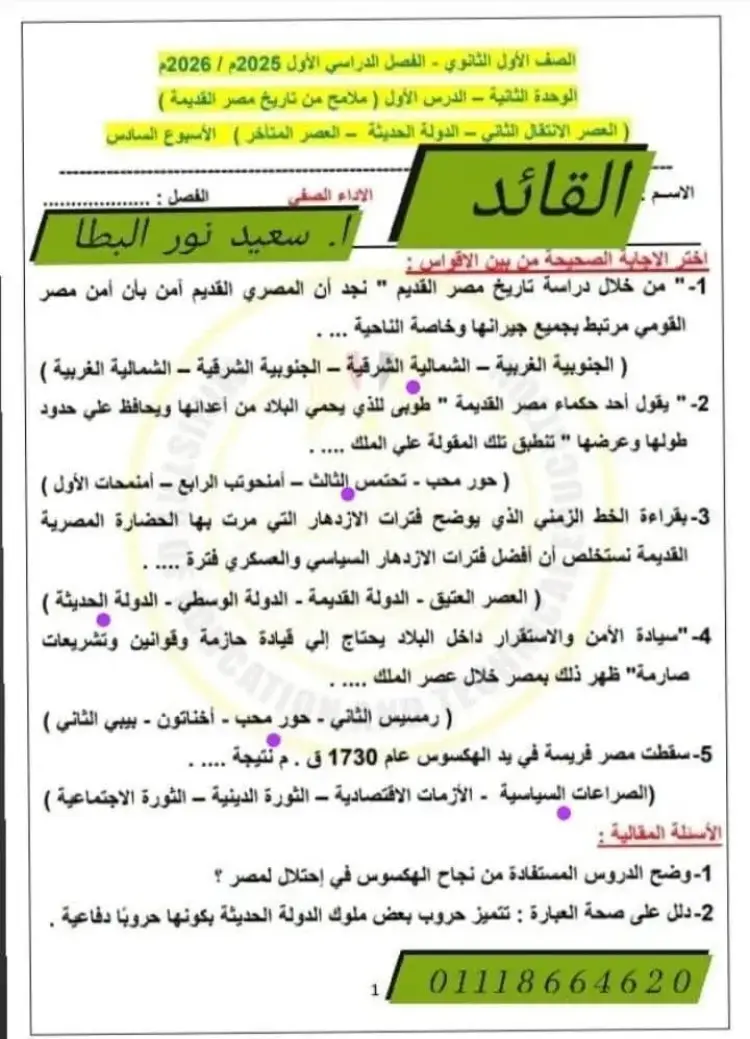 مذكرة تاريخ للصف الأول الثانوي الترم الأول pdf 2026
