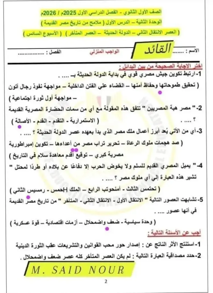 ينشر «شبابيك» حل الأداء الصفي والواجب المنزلي للأسبوع السادس في مادة التاريخ، لطلاب الصف الأول الثانوي، الفصل الدراسي الأول للعام 2025 2026.