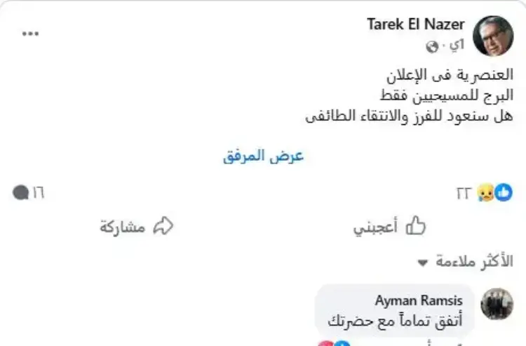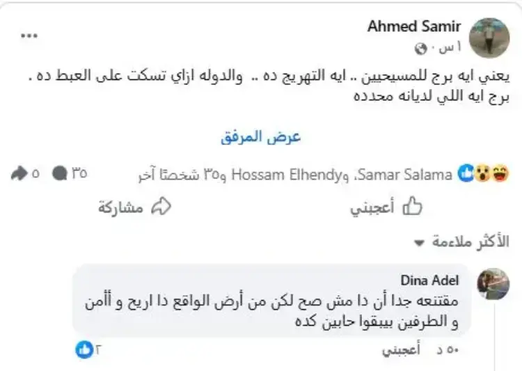 كما عبر "Ahmed Samir" عن صدمته من المبدأ، وكتب معلقا: «يعني إيه برج للمسيحيين.. إيه التهريج ده.. والدولة إزاي تسكت على العبط ده»، معتبرا أن تخصيص برج لديانة محددة أمر غير مقبول.