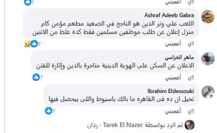 من جهته، رأى ماهر الخزامي أن «الإعلان عن السكن على الهوية الدينية متاجرة بالدين وإثارة للفتن».
