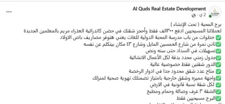 وجاء في نص المنشور: «لعملائنا المسيحيين ادفع 300 ألف فقط واحجز شقتك في حضن كاتدرائية العذراء مريم بالمعلمين الجديدة».