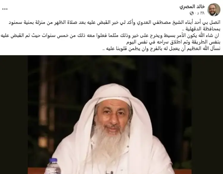 كشف المحامي خالد المصري، في منشور له عبر حسابه على فيسبوك، عن ملابسات عملية القبض على الشيخ مصطفى العدوي.