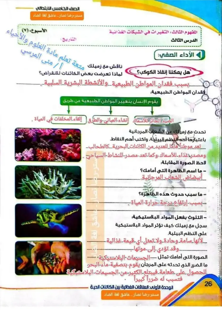 إجابات أداءات وتقييمات علوم خامسة ابتدائي الأسبوع السابع