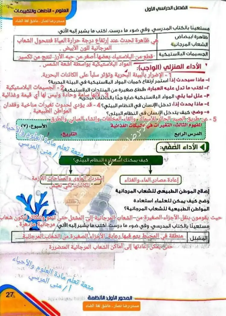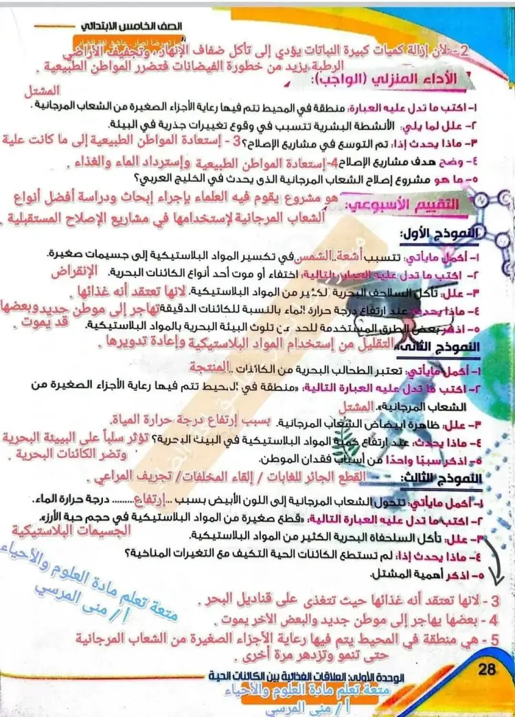 حل الأداء الصفي والواجب المنزلي والتقييم الأسبوعي السابع علوم للصف الخامس الابتدائي 2026