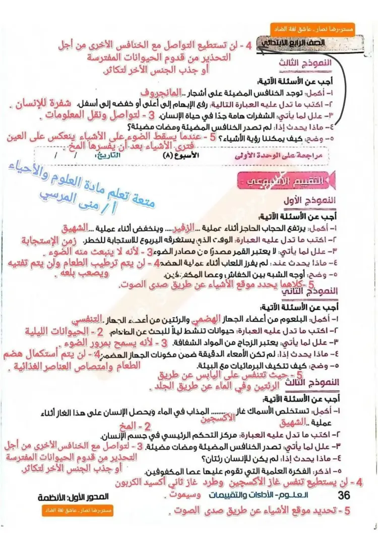 جاء حل تقييمات الأسبوع السابع علوم الصف الرابع 2026 الترم الأول على النحو التالي: