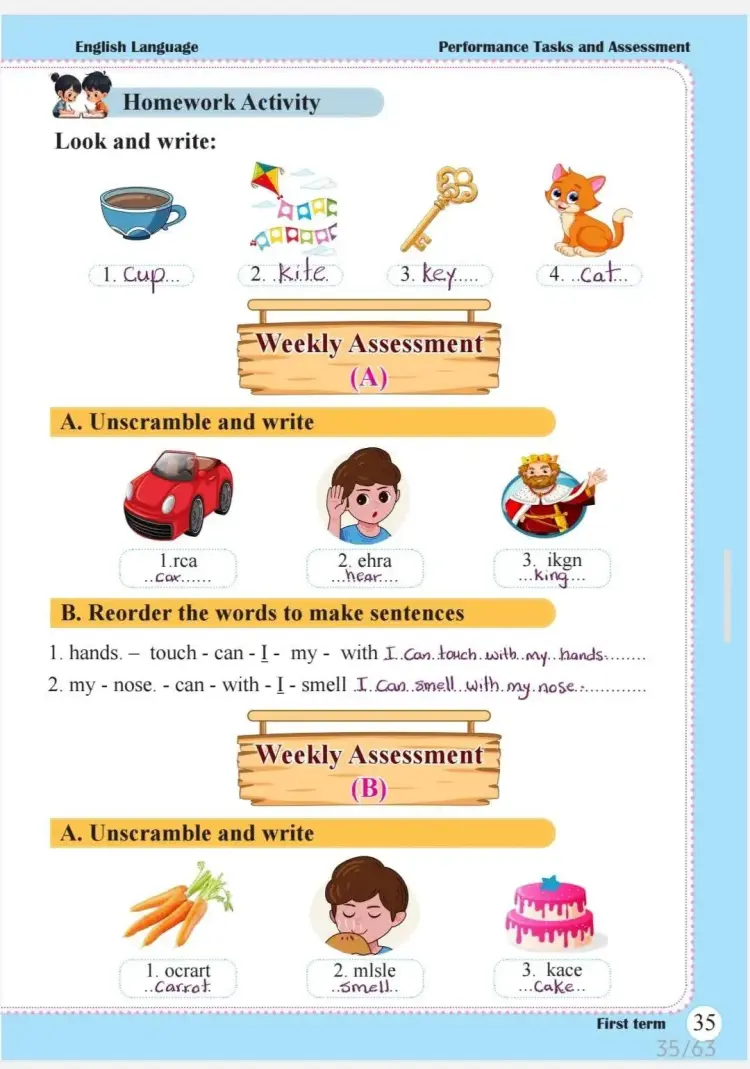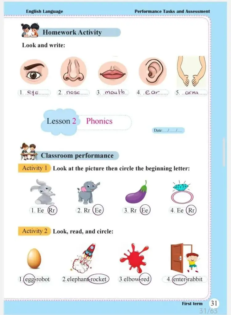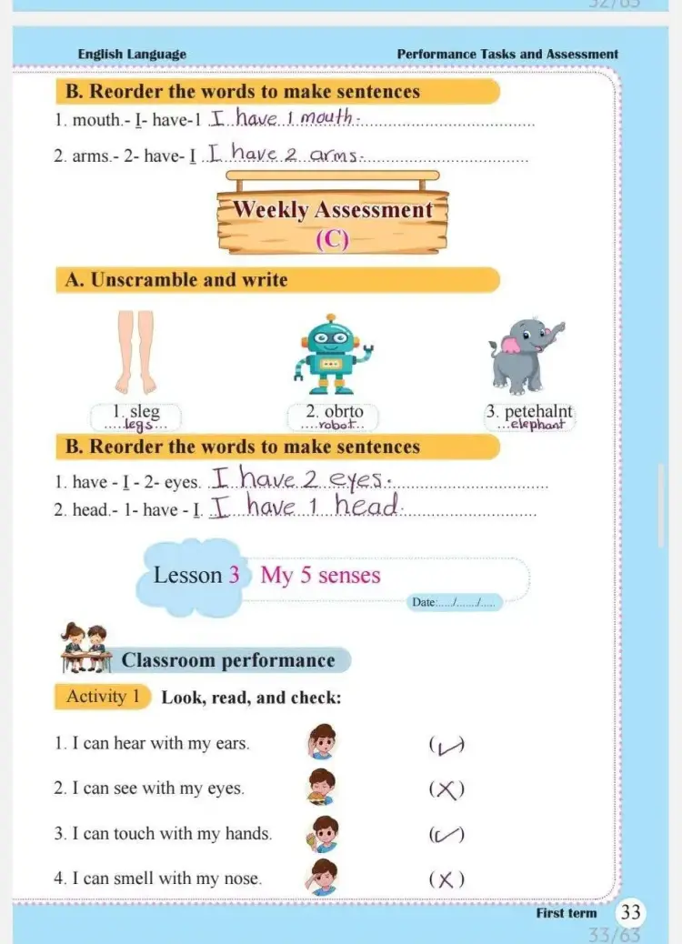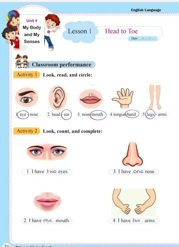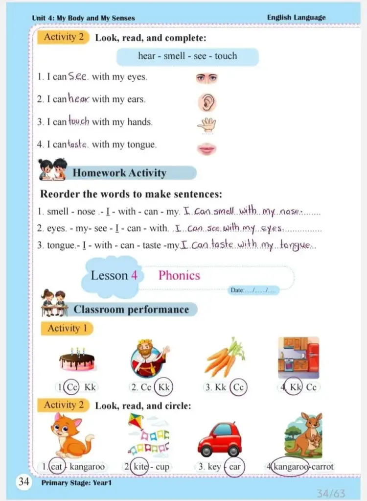 حل الأداء الصفي إنجليزي أولى ابتدائي الوحدة الرابعة ترم أول 2026