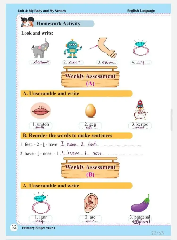 حل الواجب المنزلي إنجليزي أولى ابتدائي الوحدة الرابعة ترم أول 2026