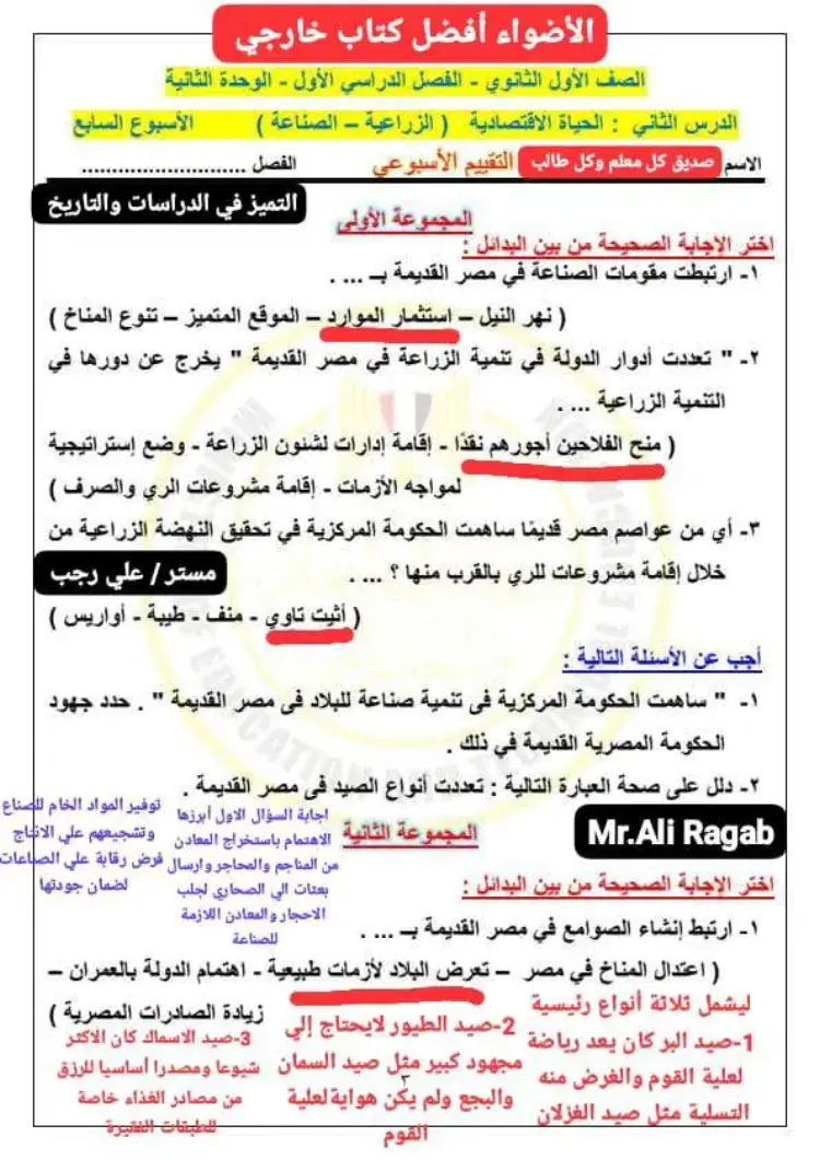 حل تقييمات الأسبوع السابع تاريخ أولى ثانوي الترم الأول 2026