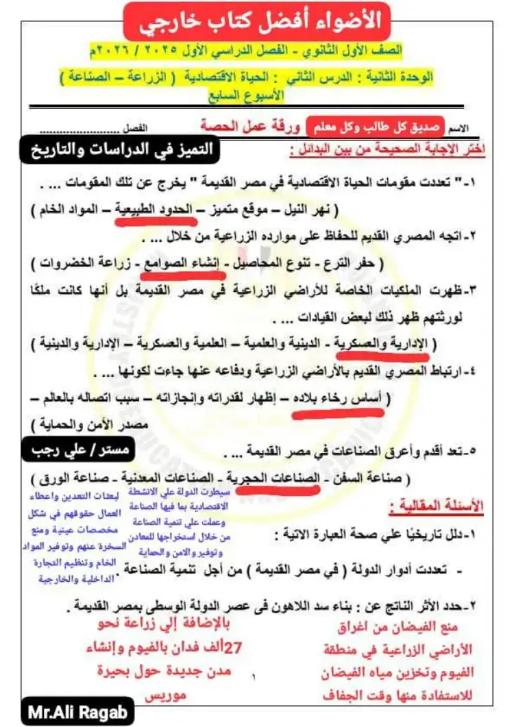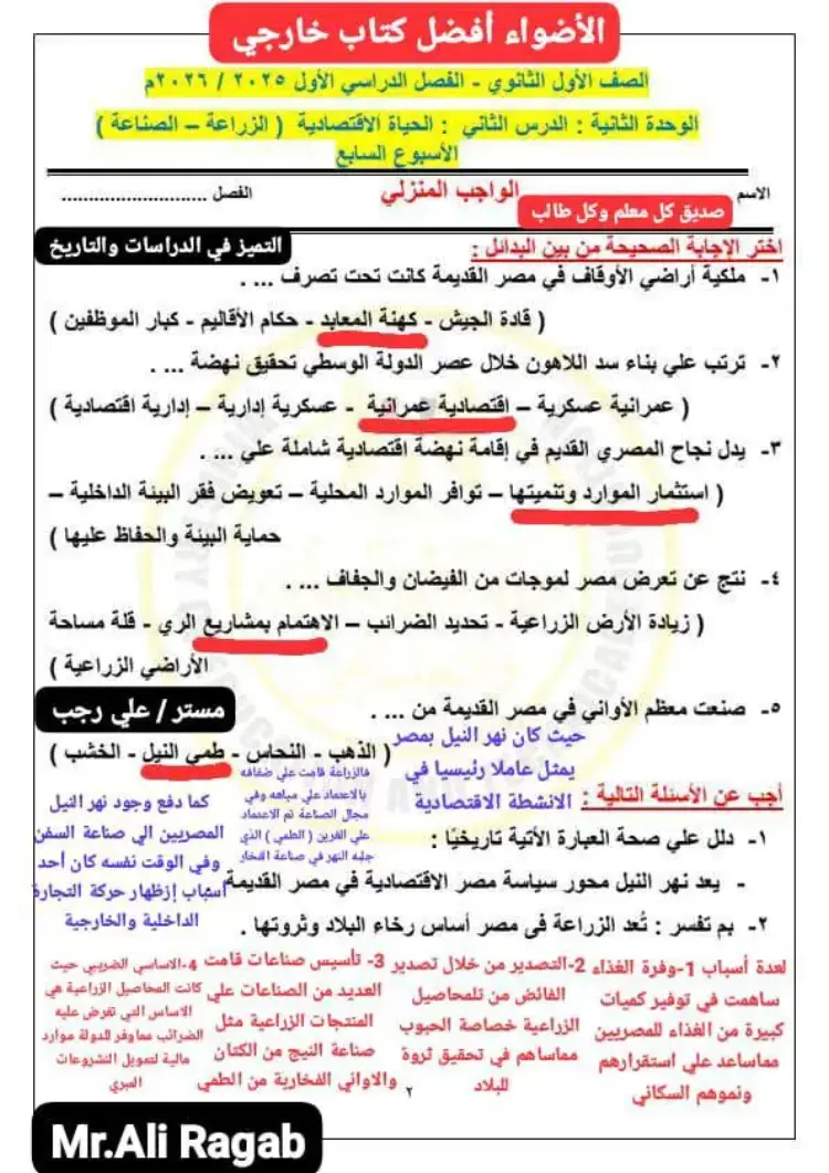حل الأداء الصفي وواجب وتقييم الأسبوع السابع تاريخ للصف الأول الثانوي ترم أول 2026
