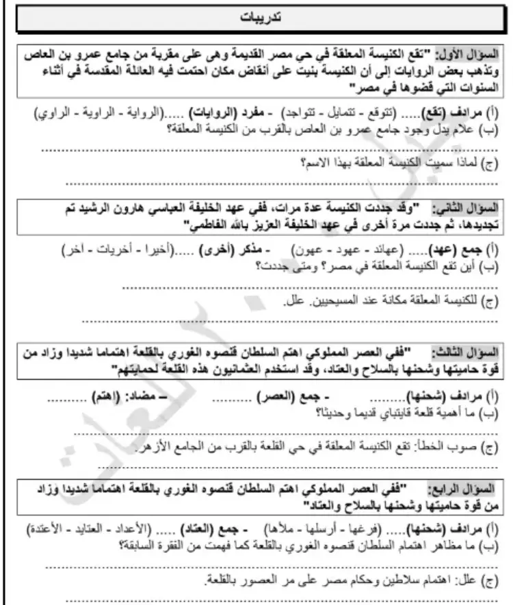 ومن بين أسئلة وتدريبات مذكرة لغة عربية للصف الثالث الإعدادي ترم أول 2026، نجد تدريبات الدرس الأول قراءة كالتالي: