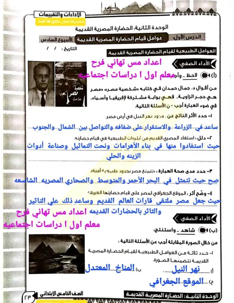 أ) حدد ثلاثة من العوامل الطبيعية لقيام الحضارة المصرية القديمة تضمنتها الصورة.