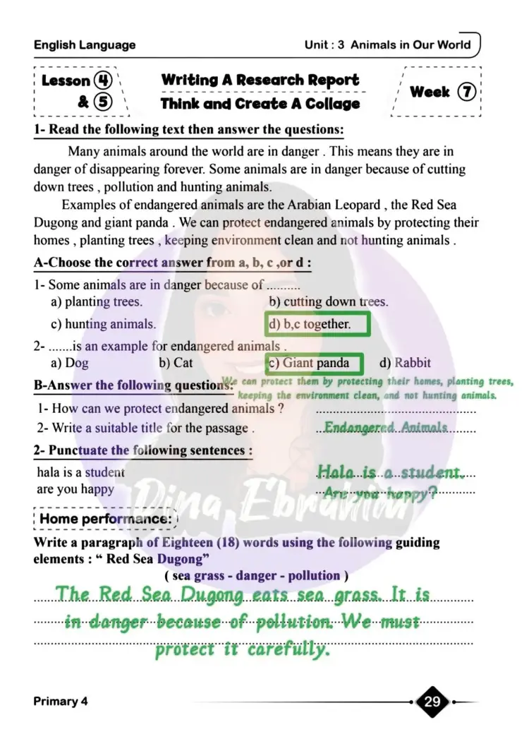 إجابة: The Red Sea Dugong eats sea grass. It is in danger because of pollution. We must protect it carefully.