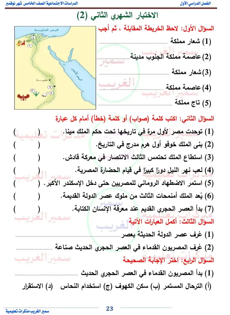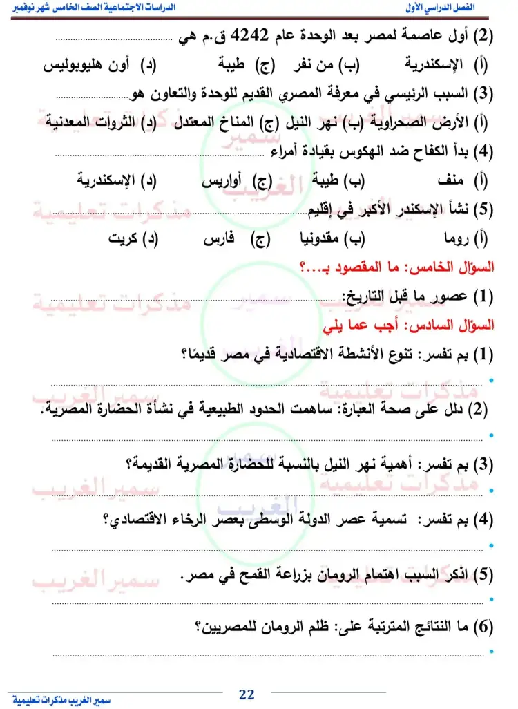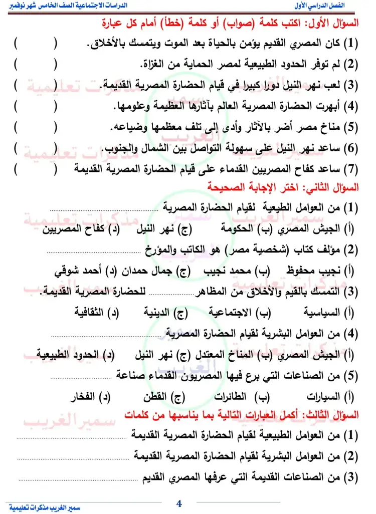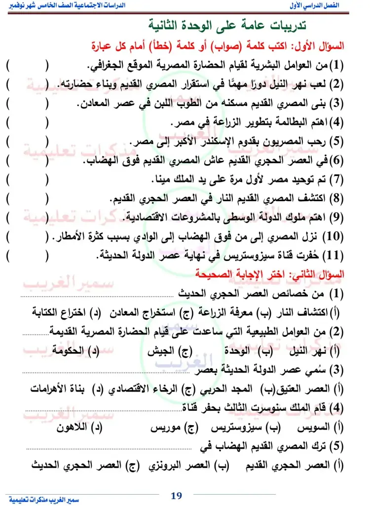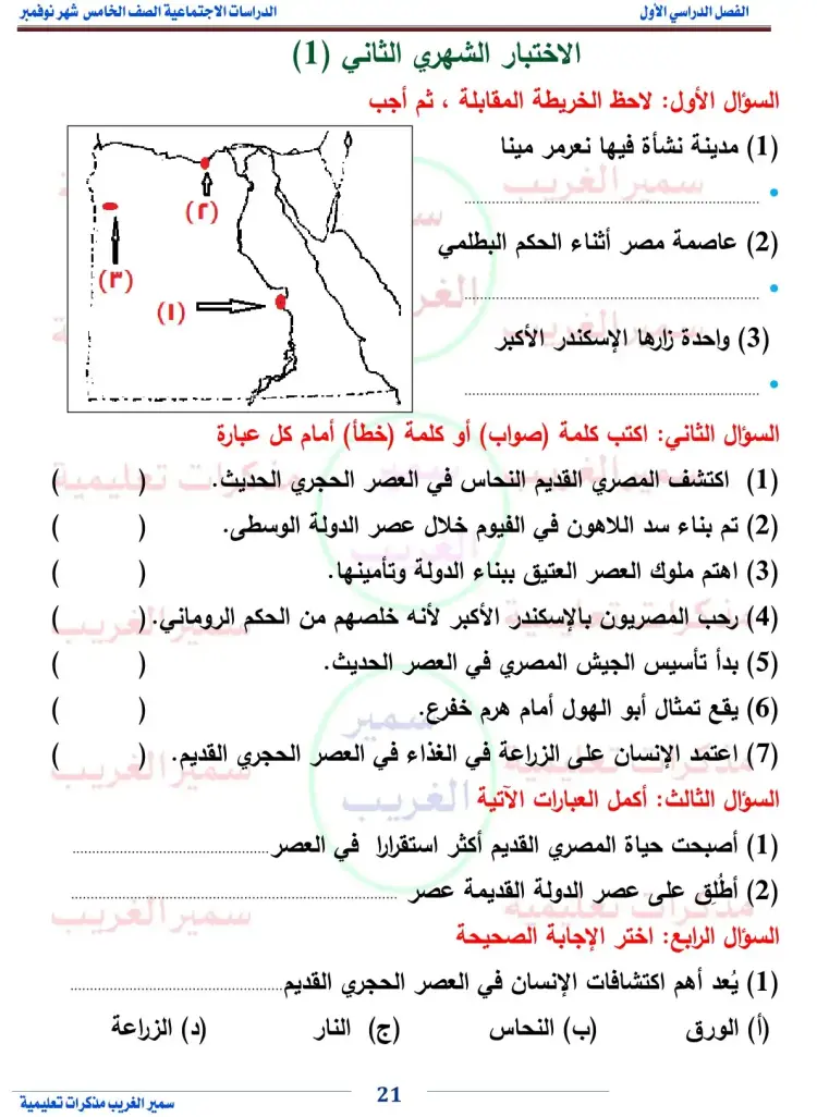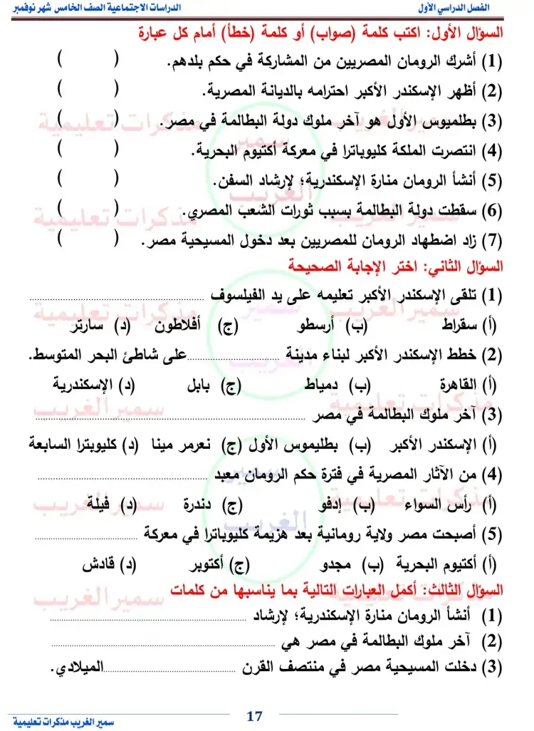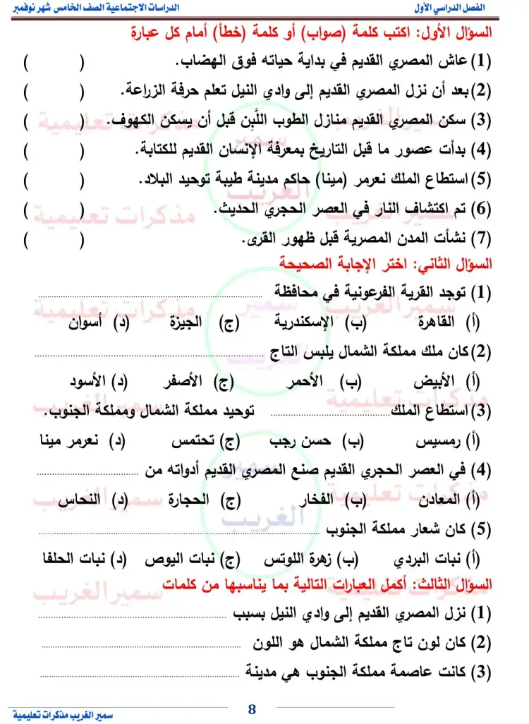 واشتملت مذكرة مراجعة شهر نوفمبر في مادة الدراسات الاجتماعية لطلاب الصف الخامس الابتدائي بالعام الدراسي 2025 2026، على بنك أسئلة متنوع كما يلي:
