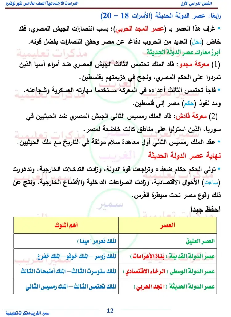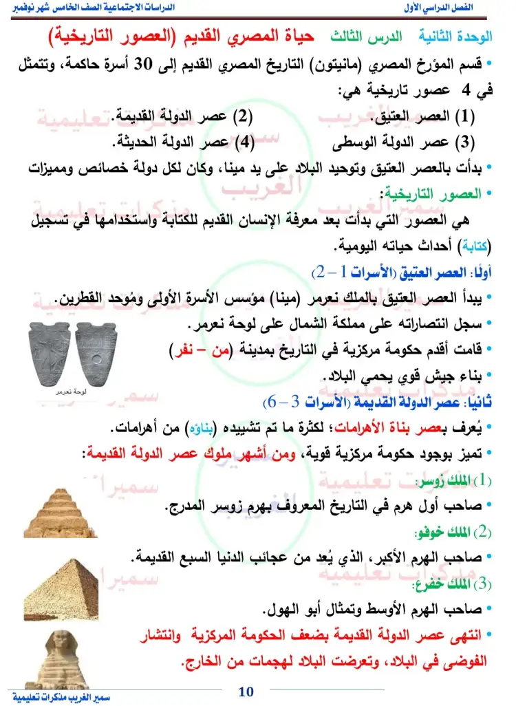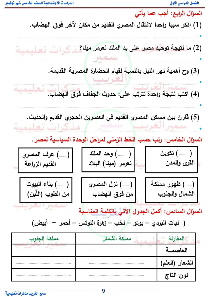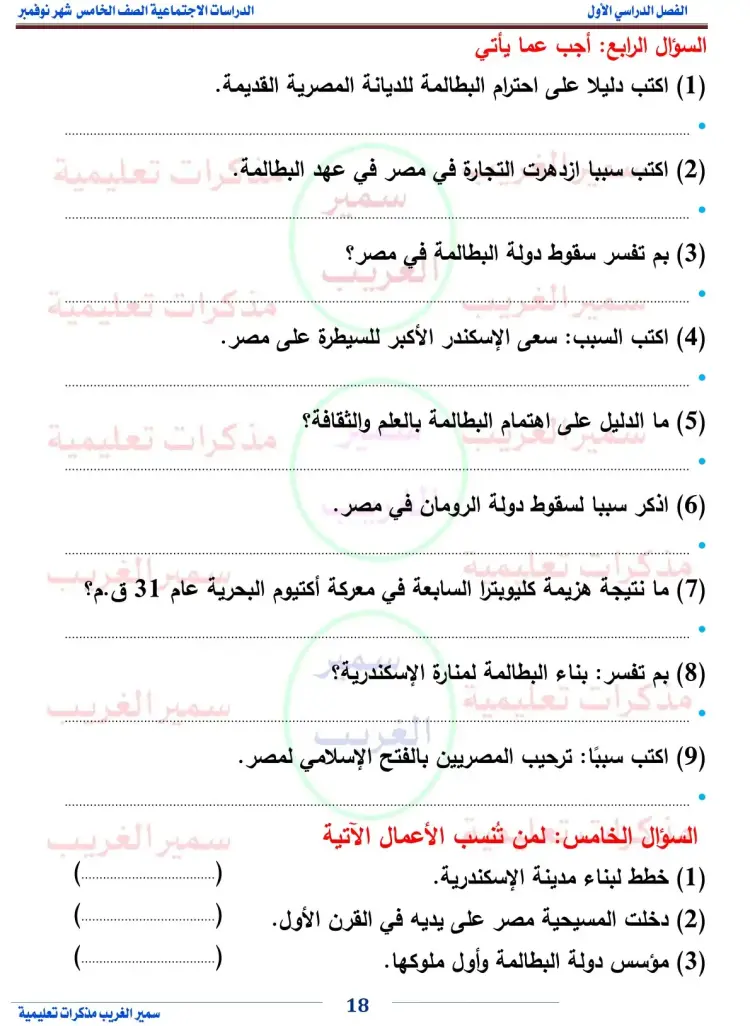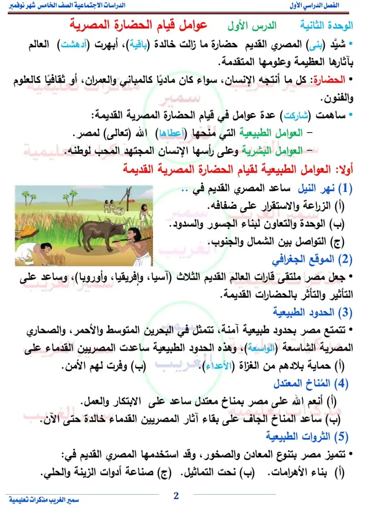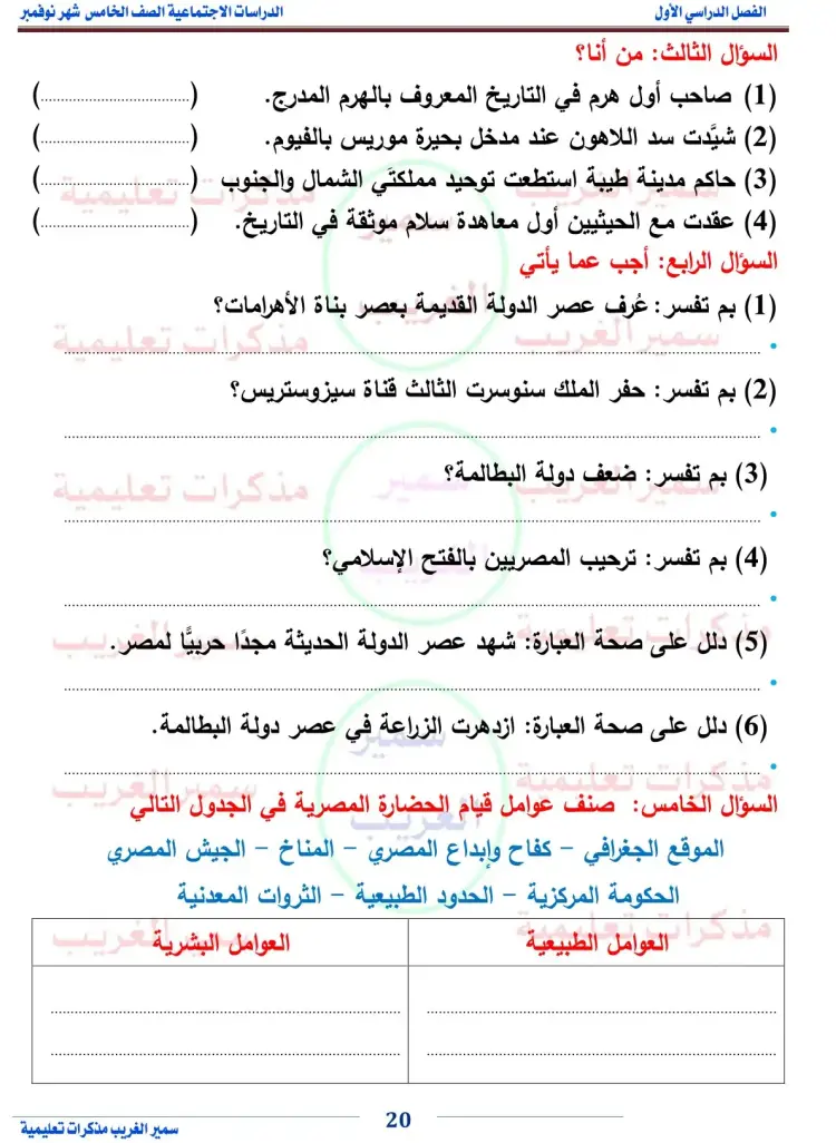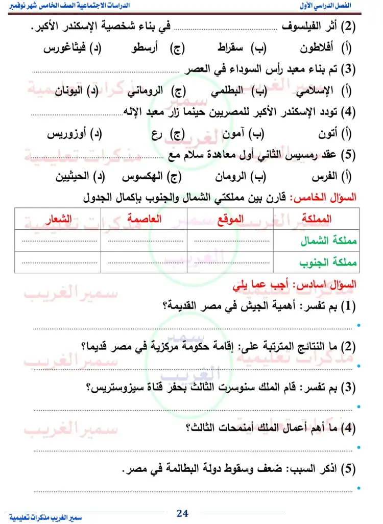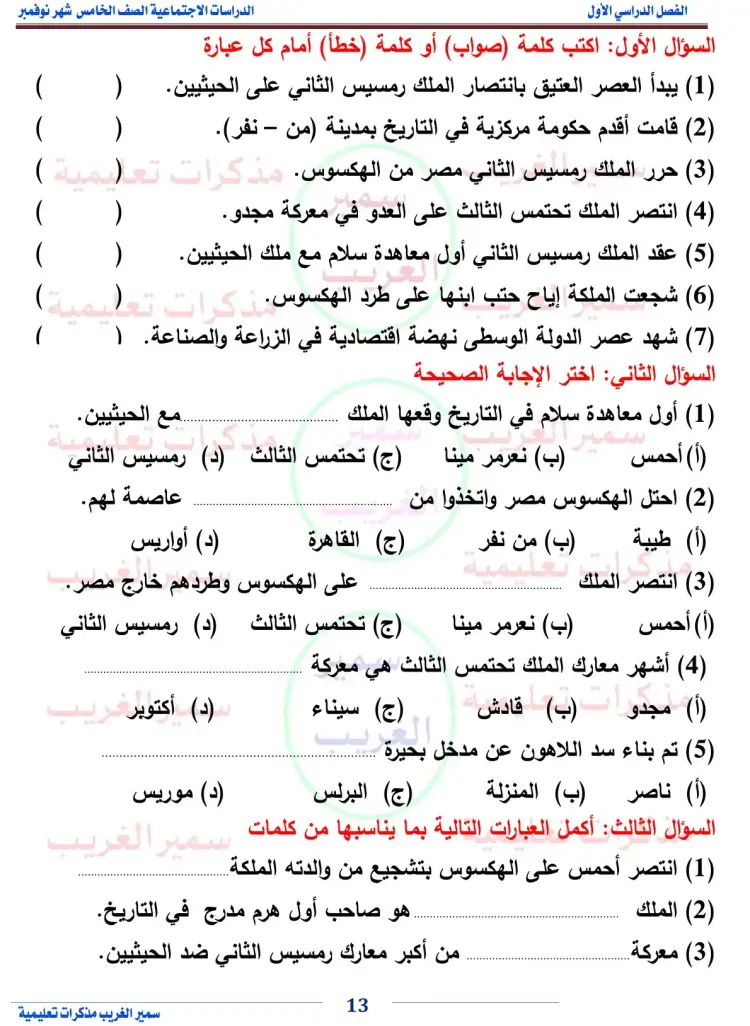 واشتملت مذكرة مراجعة شهر نوفمبر في مادة الدراسات الاجتماعية لطلاب الصف الخامس الابتدائي بالعام الدراسي 2025 2026، على بنك أسئلة متنوع كما يلي: