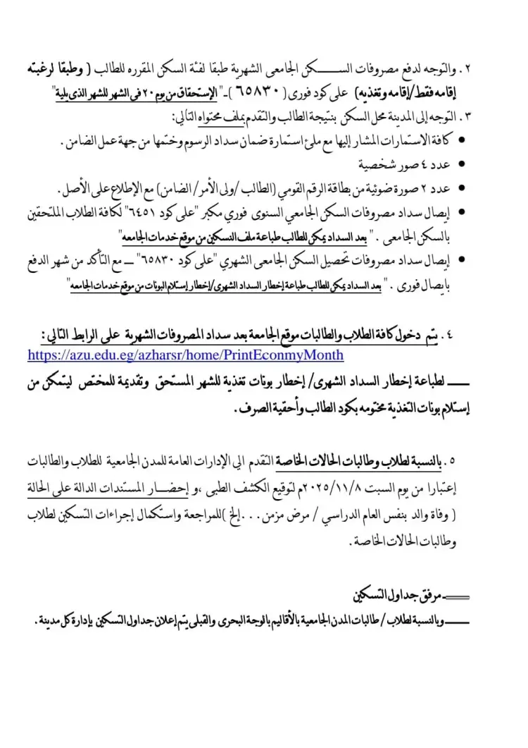 آليات سداد المصروفات السنوية والشهرية لسكن جامعة الأزهر