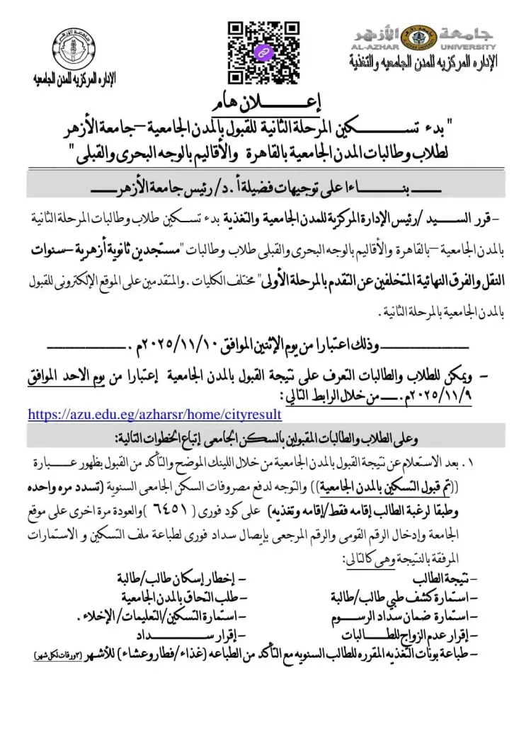 ويشمل هذا الإعلان الطلاب والطالبات المستجدين المقبولين من الثانوية الأزهرية، بالإضافة إلى الطلاب والطالبات المتخلفين عن التقديم من المرحلة الأولى، والذين سجلوا بياناتهم عبر الموقع الإلكتروني للقبول بالمدن الجامعية في القاهرة والوجهين البحري والقبلي.