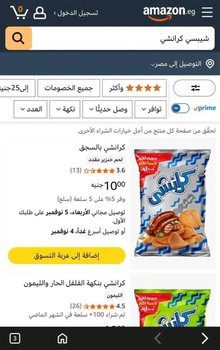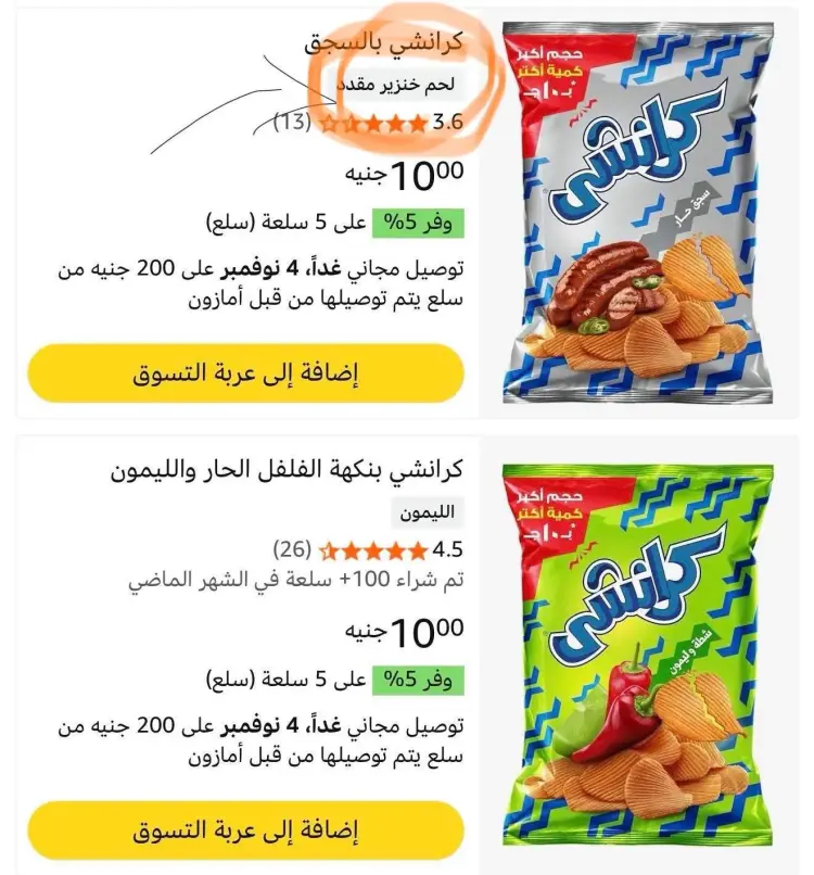 أوضحت الصورة المنشورة عبر البوستات المتداولة أن المنتج مكتوب على عبواته كرانشي بطعم السجق، أما على موقع أمازون فتظهر في وصفه عبارة لحم خنزير مقدد.
