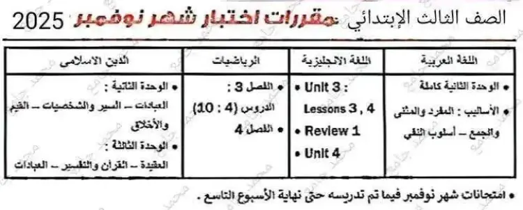 مقررات امتحان شهر نوفمبر للصف الثالث الابتدائي 2025 جميع المواد