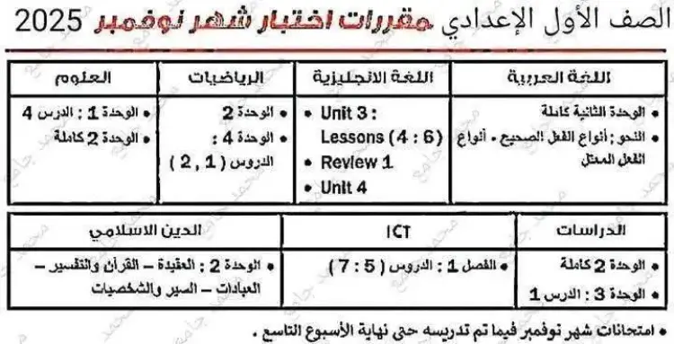 مقررات امتحان شهر نوفمبر للصف الأول الإعدادي 2025 جميع المواد