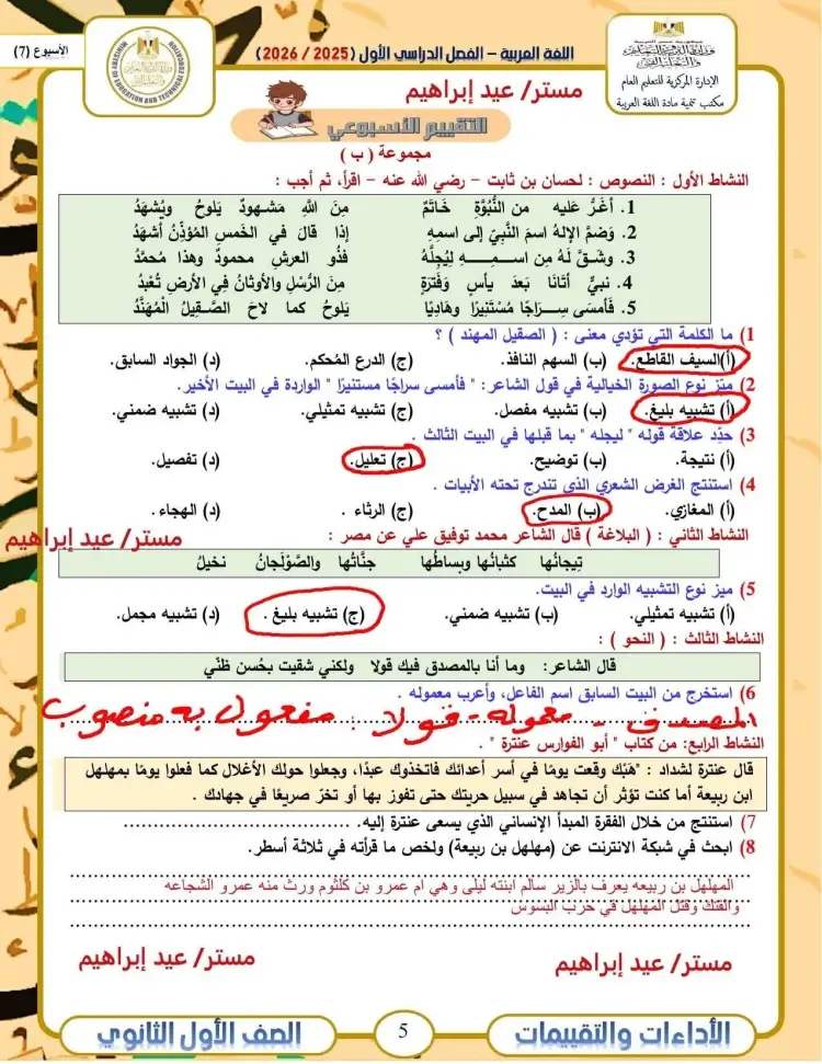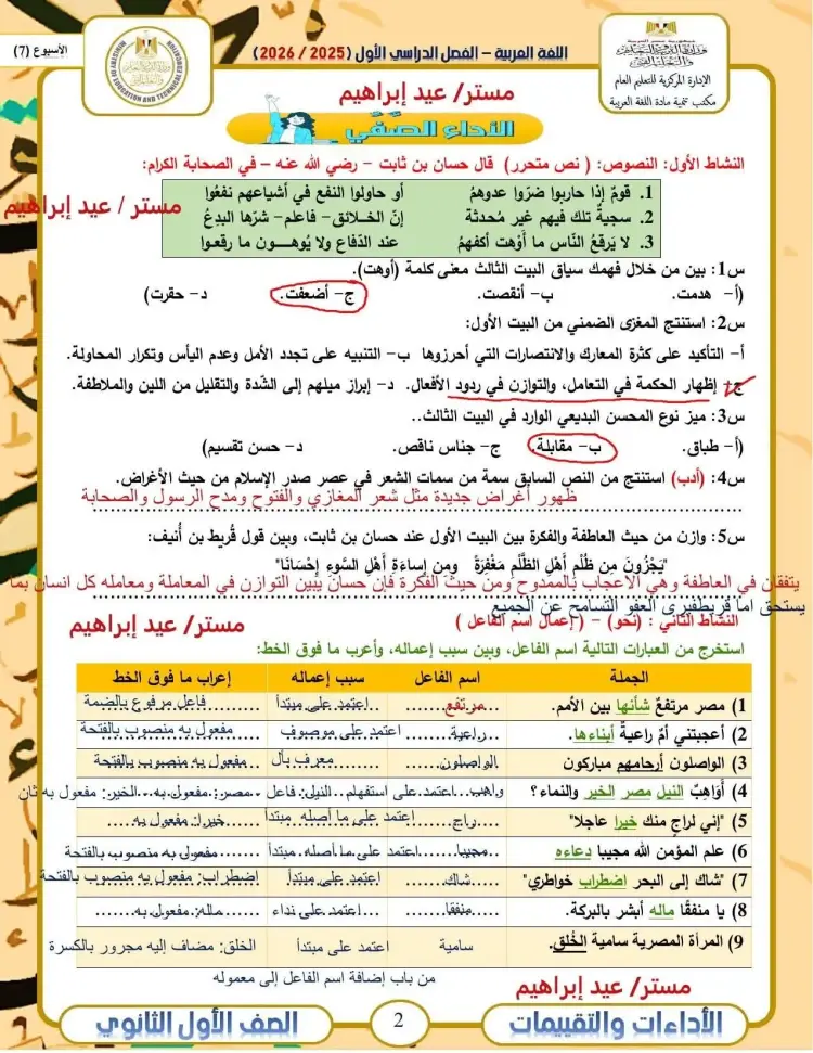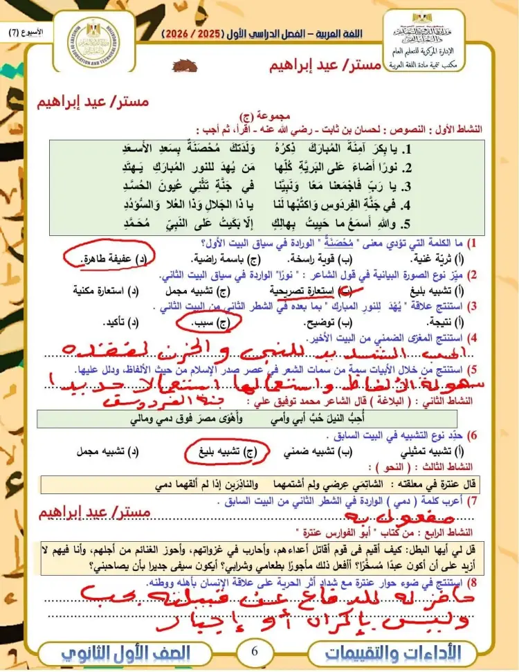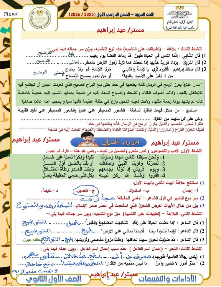 حل الأداء الصفي عربي أولى ثانوي الأسبوع السابع ترم أول 2026