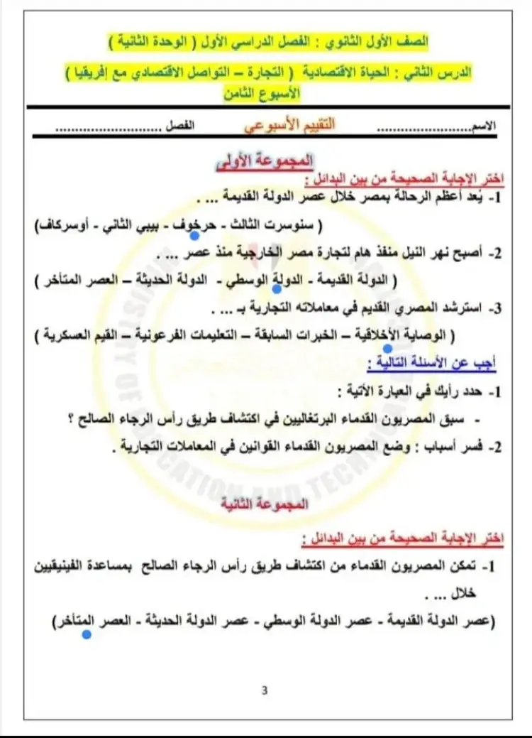 ينشر «شبابيك» حل الأداء الصفي والواجب المنزلي والتقييم الأسبوعي الثامن في مادة التاريخ، لطلاب الصف الأول الثانوي، الفصل الدراسي الأول للعام 2025 2026.