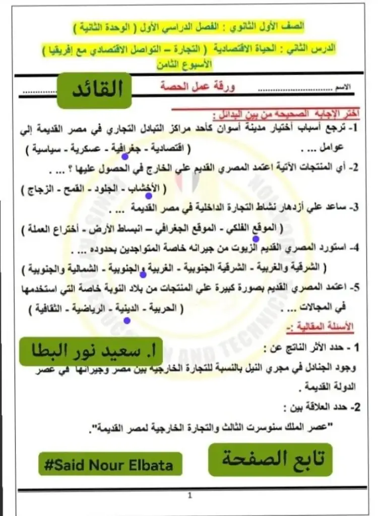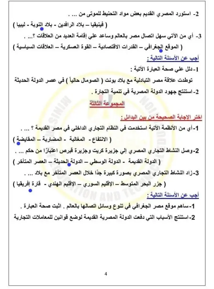 1. ترجع أسباب اختيار مدينة أسوان كأحد مراكز التبادل التجاري في مصر القديمة إلى عوامل ... ( اقتصادية - جغرافية - عسكرية - سياسية )