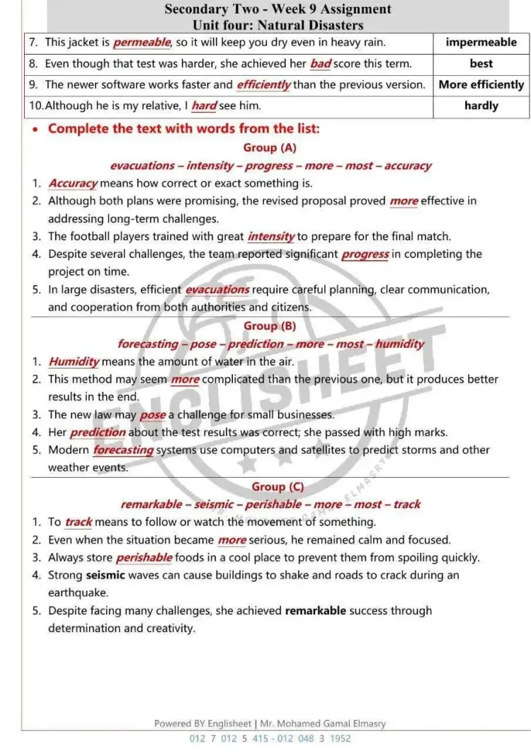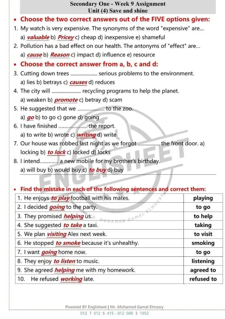 حل أداءات وتقييمات انجليزي أولى ثانوي الأسبوع التاسع 2026