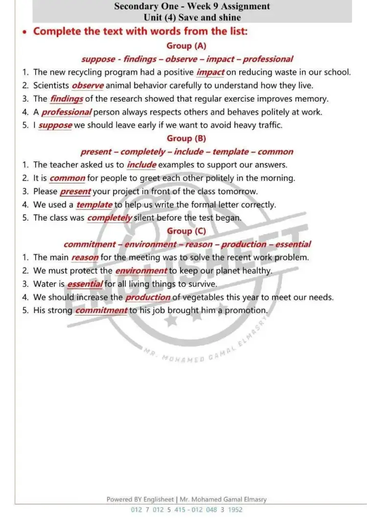 Group (C) Word list: commitment - environment - reason - production - essential
