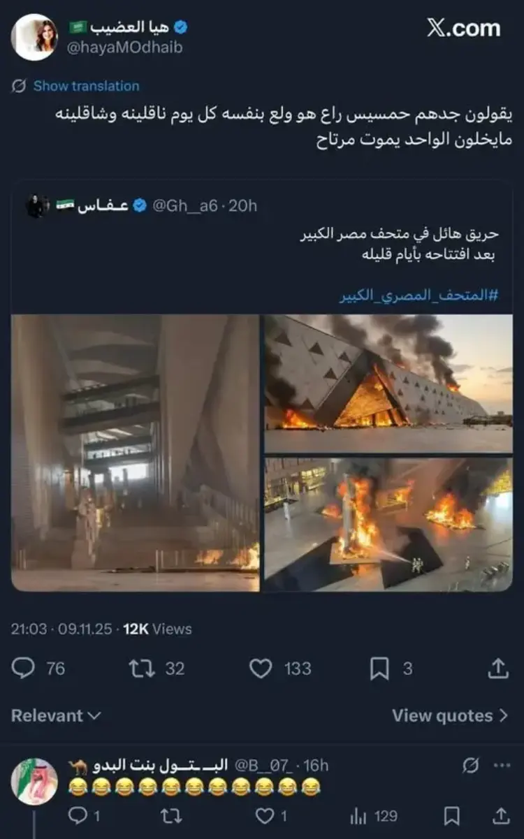 أظهرت الصور، التي تداولتها حسابات يشير أصحابها أنهم ينتمون لجنسيات عربية مختلفة، ألسنة لهب ودخان تتصاعد من المتحف المصري الكبير، مصحوبة بتعليقات تحمل طابع السخرية بعد أيام قليلة من الافتتاح العالمي.
