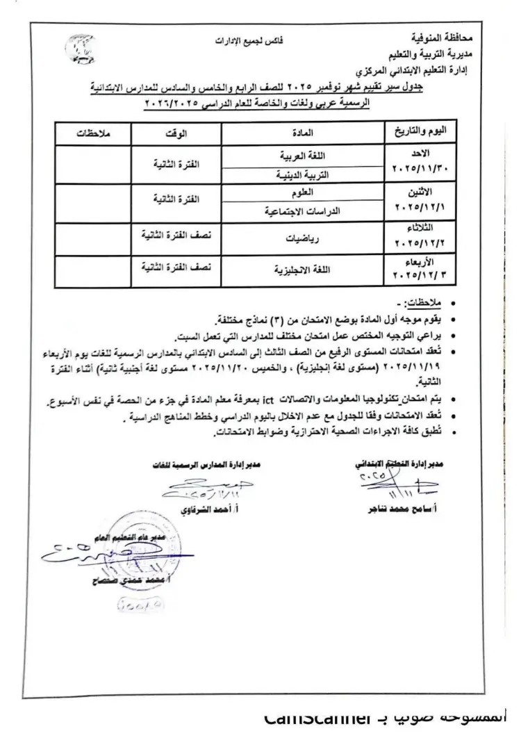 جدول امتحانات الصف السادس الابتدائي شهر نوفمبر 2025 المنوفية