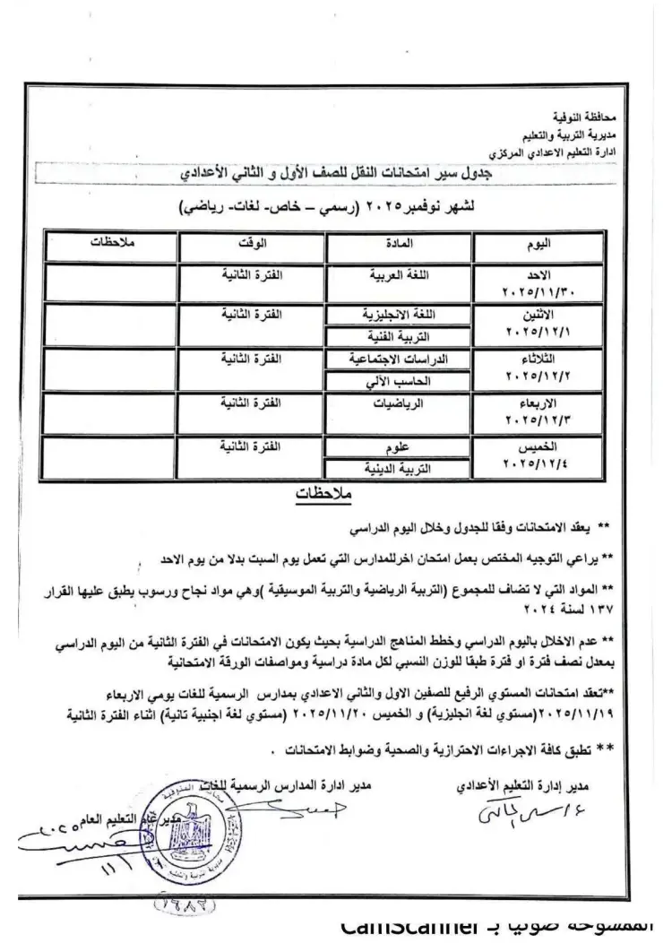 جدول امتحانات شهر نوفمبر الصف الثاني الإعدادي 2025 المنوفية