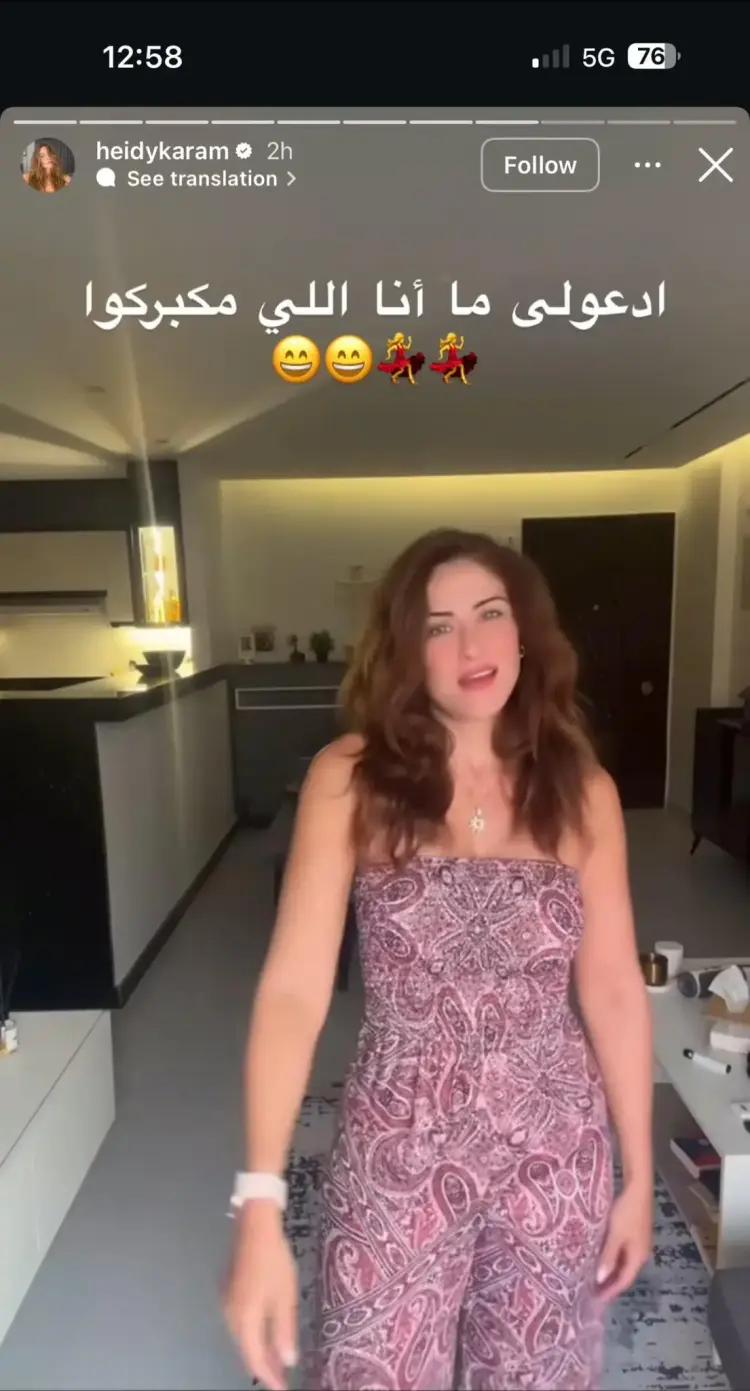 وظهرت هيدي كرم في مقطع فيديو وهي في حالة مزاجية جيدة وتبدو وكأنها ترقص، وأرفقت المقطع بتعليق لافت ومثير للجدل جاء فيه: «ادعولي ما أنا اللي مكبركوا»، مصحوبا برموز تعبيرية ضاحكة وراقصة.