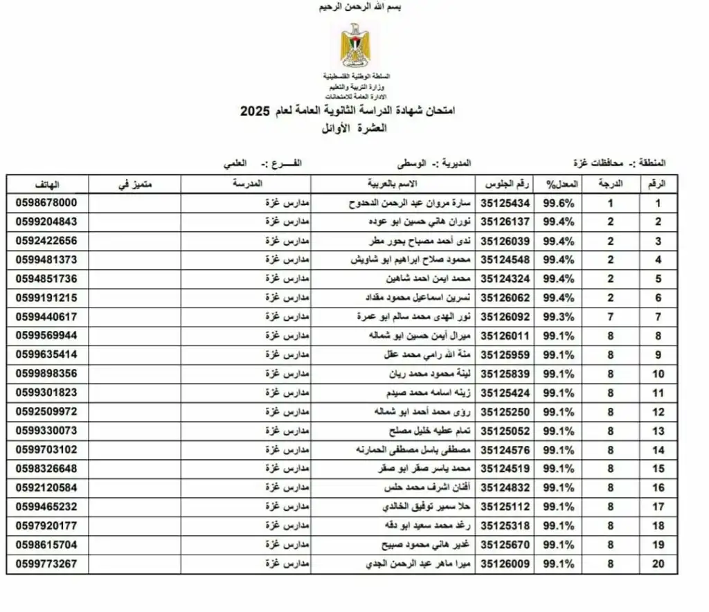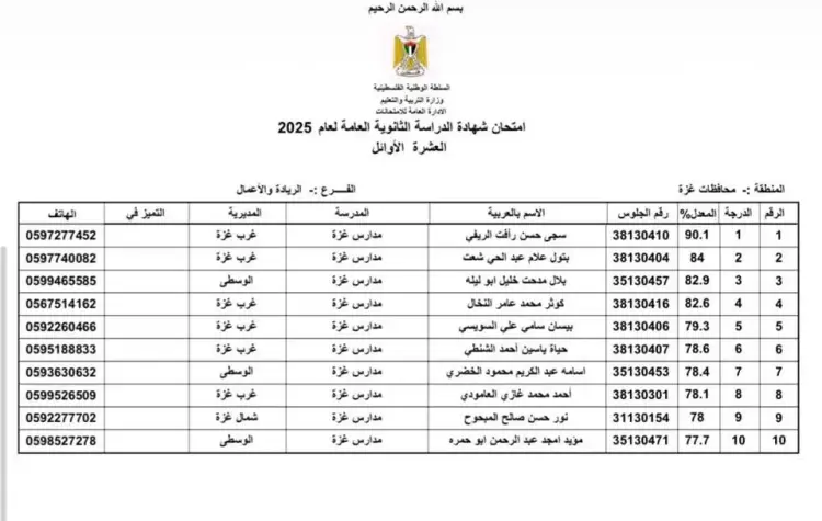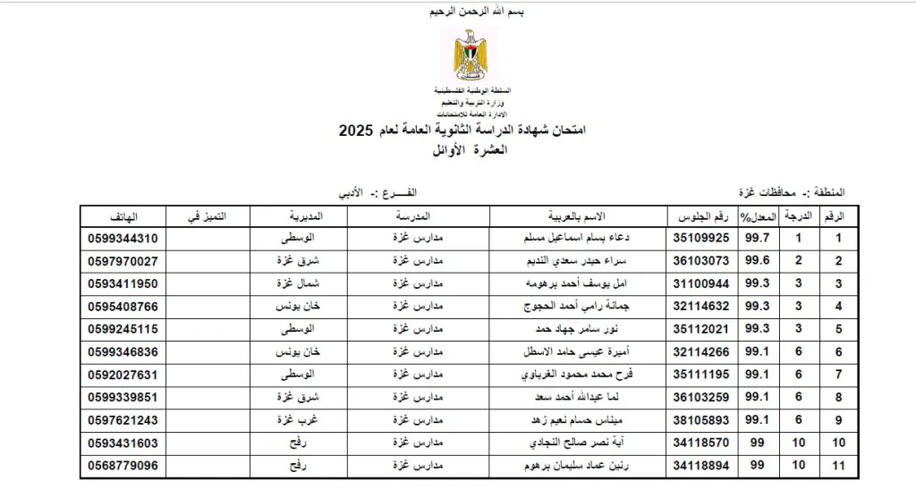 قوائم الأوائل في نتائج توجيهي غزة 2025