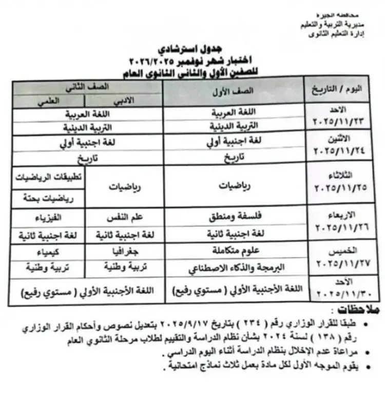 جدول امتحانات شهر نوفمبر للصف الثاني الثانوي محافظة الجيزة 2026