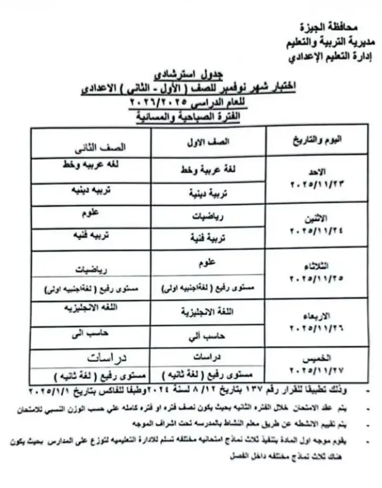 جدول امتحانات شهر نوفمبر للصف الأول الإعدادي محافظة الجيزة 2026