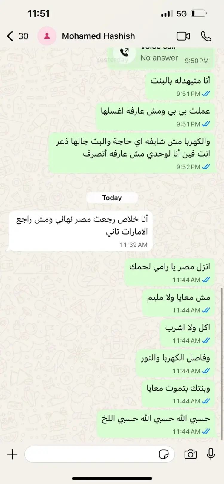 حاولت التواصل معه ولكن دون جدوى، قبل أن تتلقى رسالة منه يؤكد فيها أنه غادر الإمارات إلى مصر، تاركا إياها وابنتها دون أموال أو مرافق أساسية للحياة.