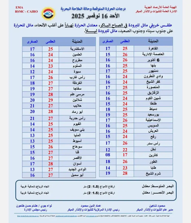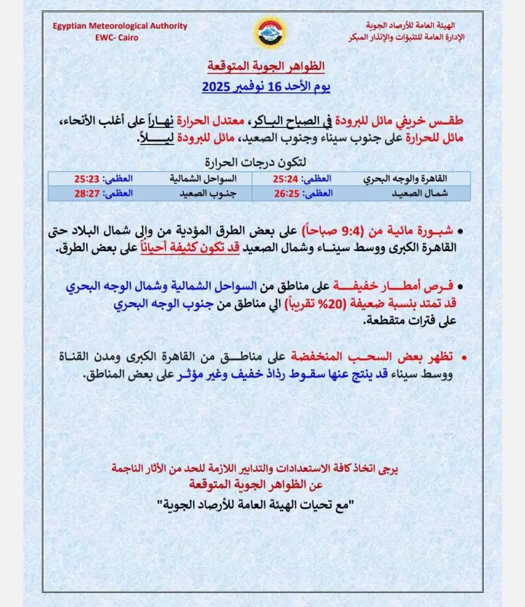 كشفت الهيئة العامة للأرصاد الجوية المصرية توقعات حالة الطقس الأحد، الموافق 16 من نوفمبر 2025، في كافة أنحاء البلاد.