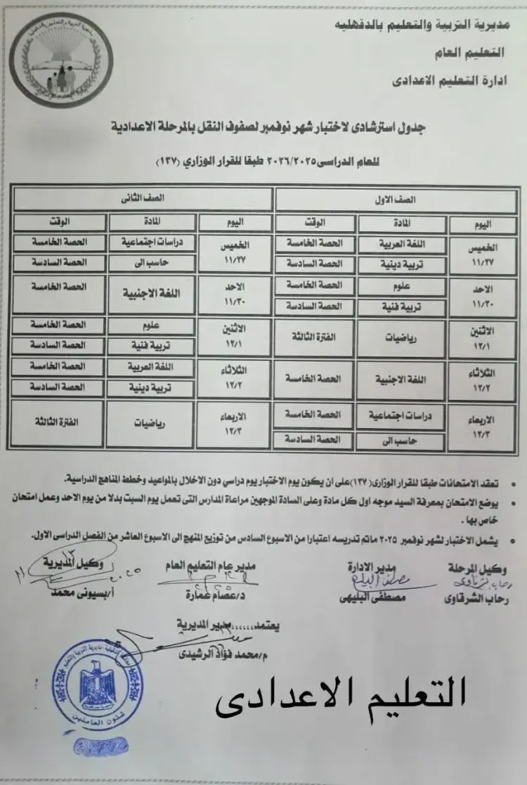 جاء جدول امتحانات شهر نوفمبر أولى إعدادي محافظة الدقهلية 2025 على النحو التالي: