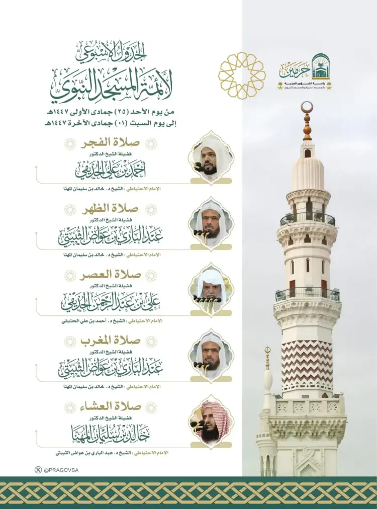 جدول أئمة المسجد النبوي هذا الأسبوع 1447