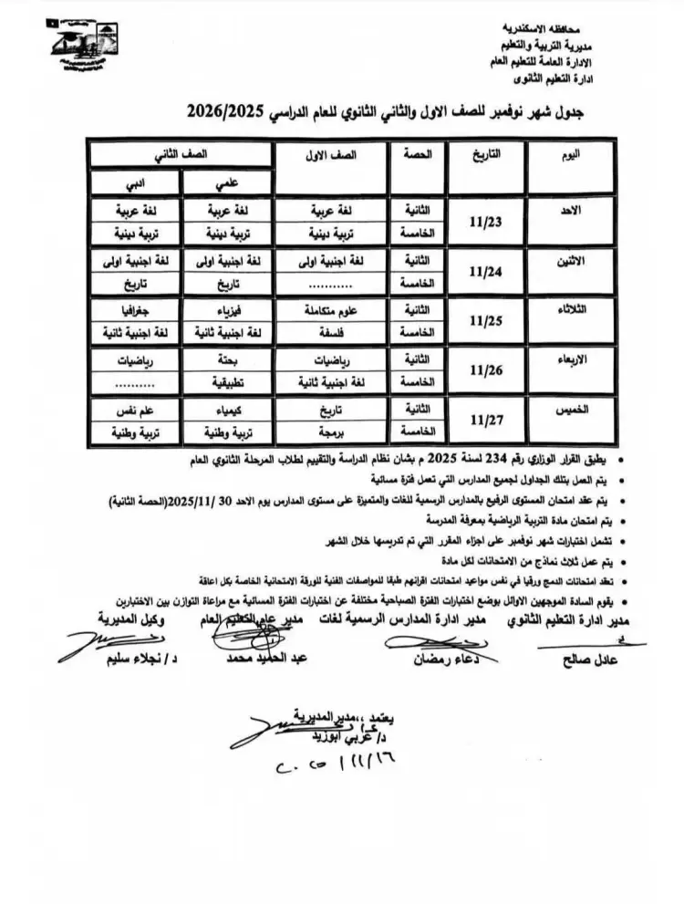 جدول امتحانات شهر نوفمبر تانية ثانوي محافظة الإسكندرية 2025