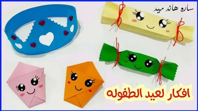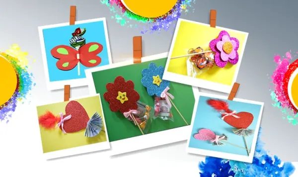• أزهار الهدايا اللامعة: تتضمن صنع زهور من الفوم اللامع أو الورق المقوى، تثبت عليها قطعة حلوى صغيرة، وتقدم للأطفال بطريقة بسيطة وجذابة.
